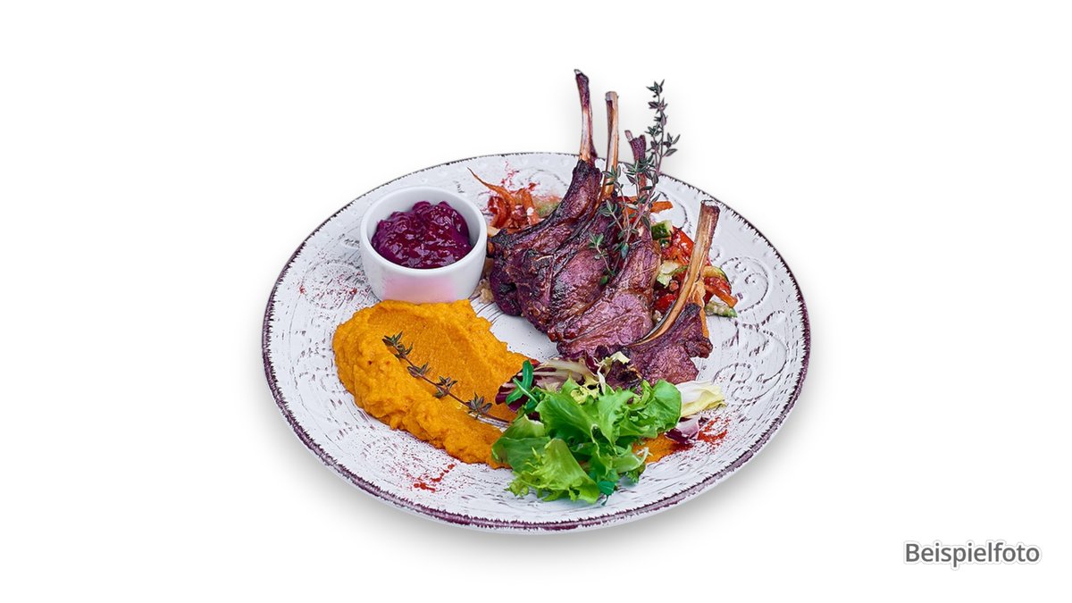 saftiges in Gewürzen, Knoblauch und Zwiebeln mariniertes und dann am Spieß gegrilltes Lammkarree