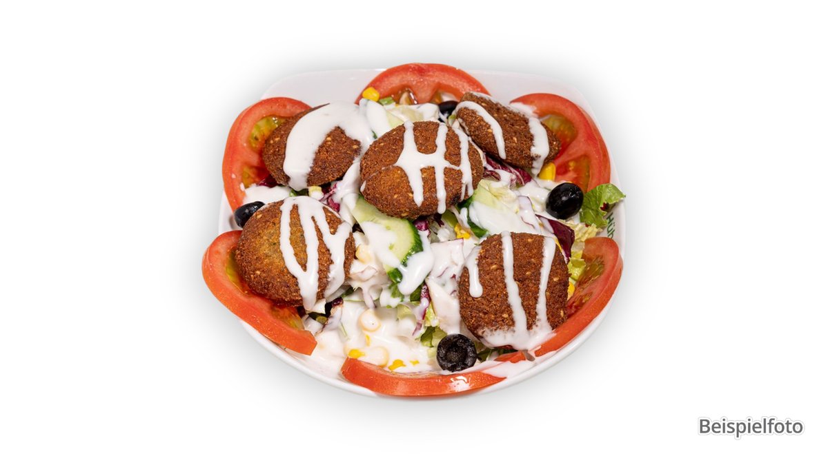 alle Gerichte werden mit Salat und Soße zubereitet („17. Falafel-Teller” wird ohne Salat zubereitet)