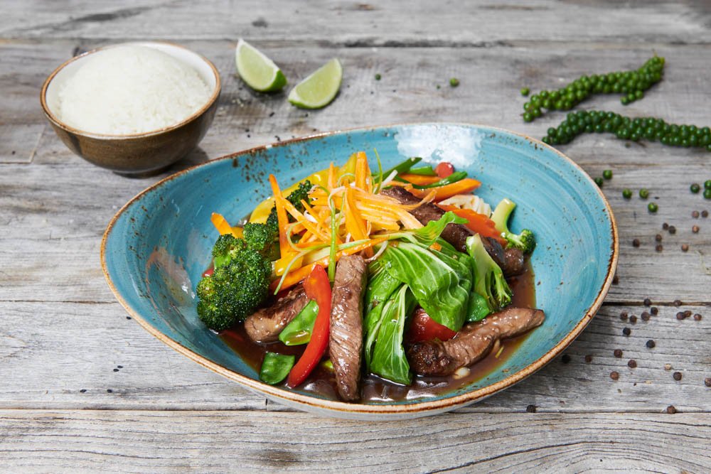 mit gebratenen Hähnchenbruststreifen in würziger Soße, frischer Ingwer, Knoblauch, Green Thai Gemüsemischung und einer Schale frischen Reis