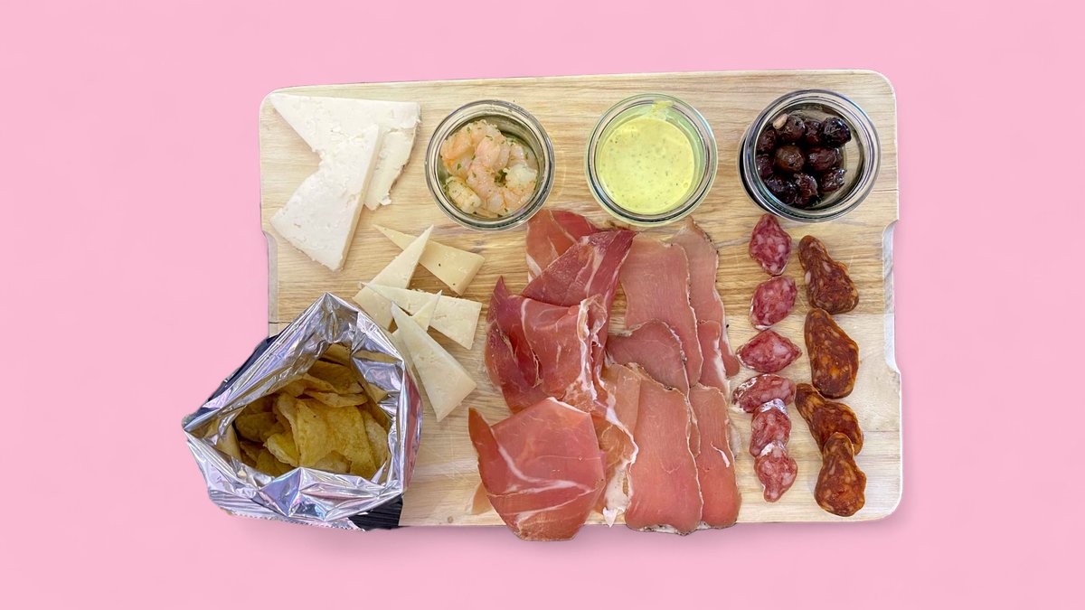 Chorizo, Lomo (luftgetrocknete Lende) und Serrano-Schinken Gran Riserva vom Durco-Schwein, Queso Semicurado (mild gereifter Hartkäse aus pasteurisierter Ziegenmilch), Manchego (Hartkäse vom Schaf), luftgetrocknete Fuet-Salami mit Knoblauch, marinierte Garnelen mit Knoblauch und Petersilie, Oliven mit Pinienkernen, Orangen-Aioli, Patatas Fritas (Kartoffelchips, 45g) (L,N)