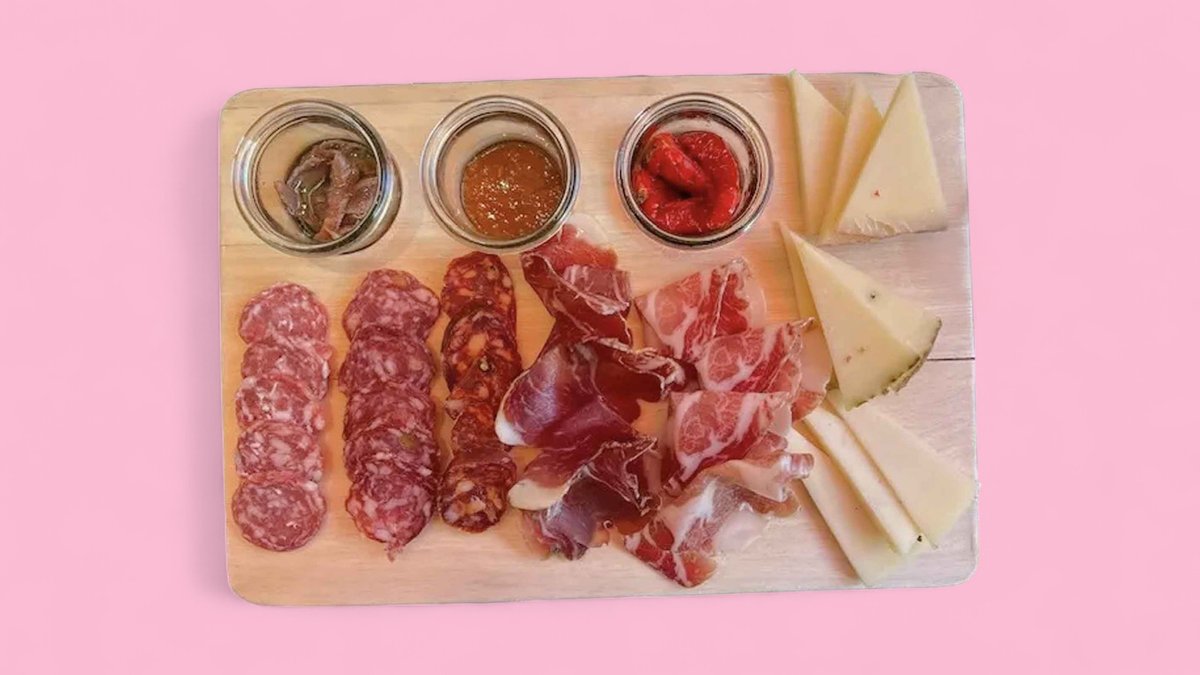 von der Sonneninsel Sizilien mit Caprino Stagionato (gereifter Ziegenkäse), Pistazien, bestäubtem Pecorino, Culatello-Schinken, zweierlei Salami vom schwarzen Nebrodi-Schwein, Salami Pistacchio Piccante, Sardellen, gegrillten Tomaten, Konfitüre und Brot