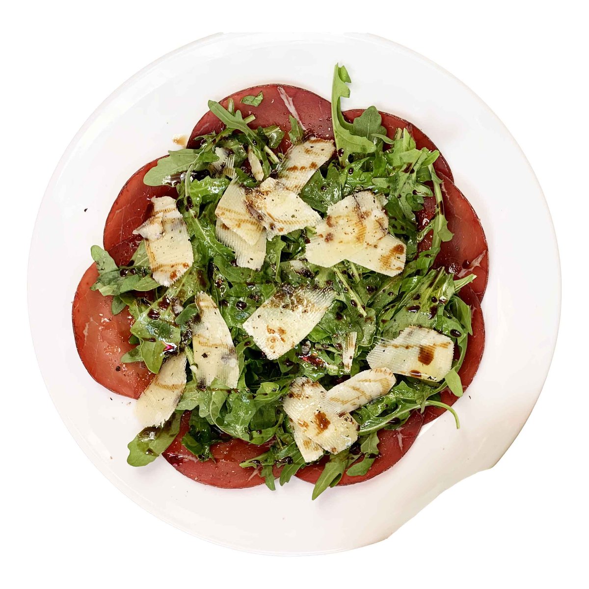 Bresaola [ital. Rinderschinken], Rucola, BIO-Parmigiano Reggiano DOP 15 Monate gereift, ital. Olivenöl, wahlweise Zitronensaft oder Aceto Balsamico di Modena 10 Jahre alt, Brot (L,G,S)