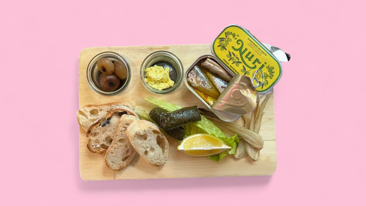 Sardinen in Olivenöl – Nuri, 125g in der Dose, dazu Orangen-Aioli, Zitrone, mit Reis gefüllte Weinblätter, eingelegte Kapernäpfel und Brot
