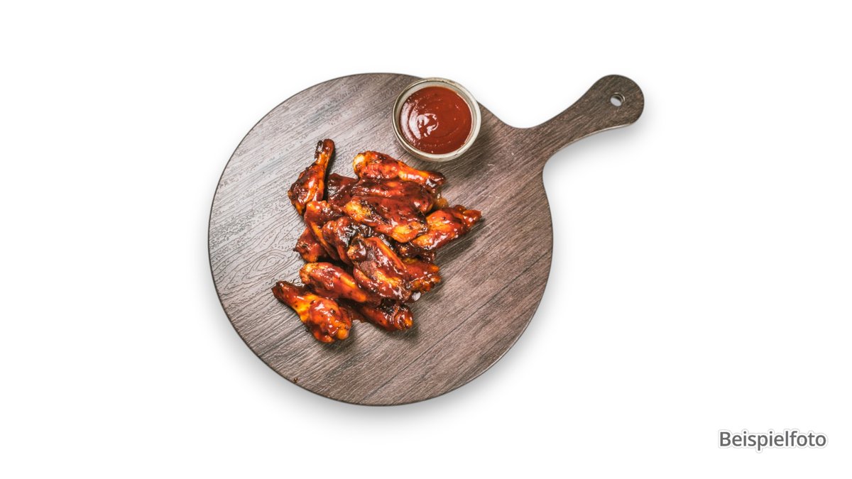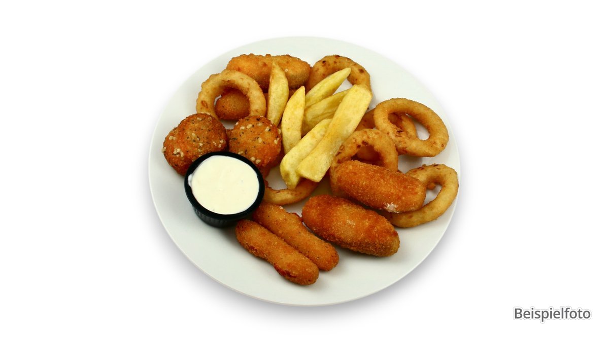 10 Stück mit Chicken-Nuggets, Chicken-Wings, Onion-Rings, Chilli-Poppers, Mozzarella-Sticks und 2 Soßen deiner Wahl