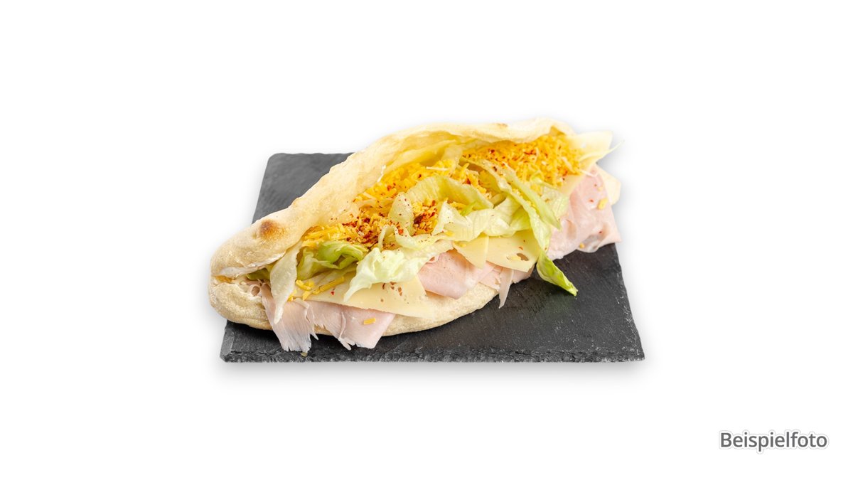 mit Speck vom Schwein, Tomaten, Käse, Salat, Gurken, Röstzwiebeln und Snackdressing