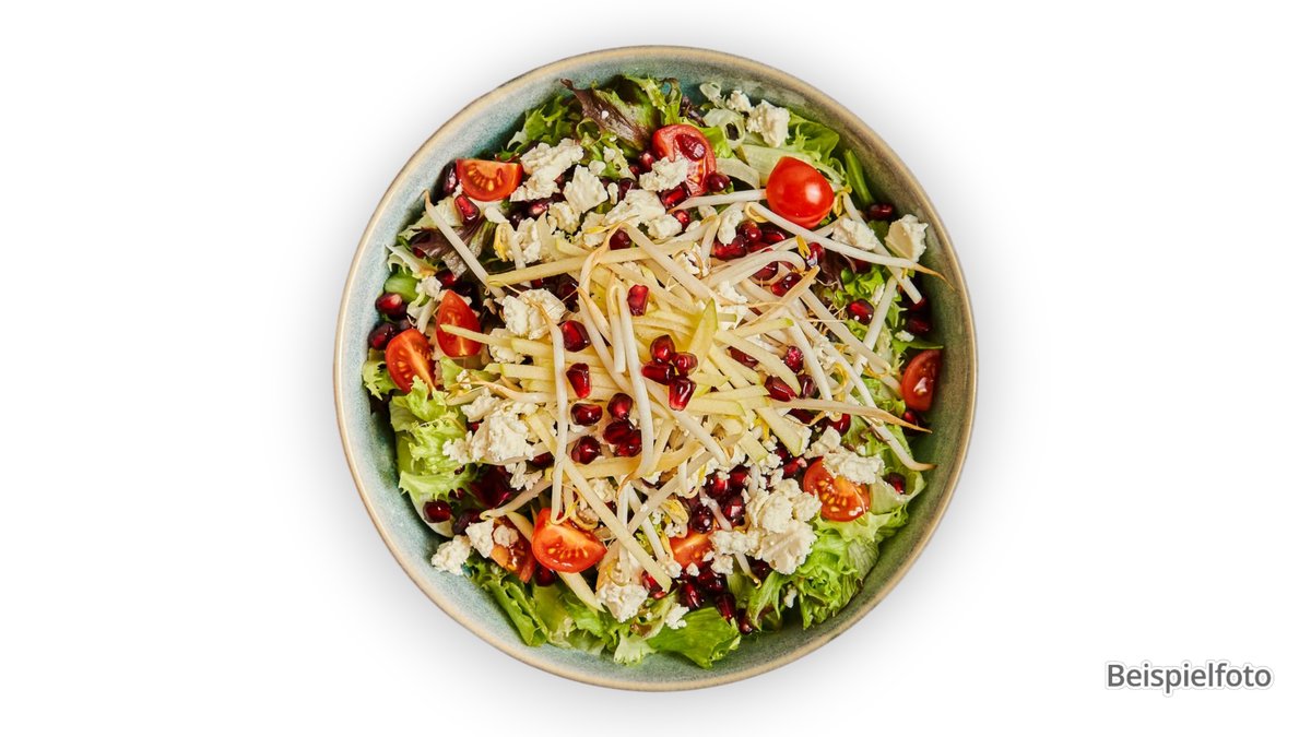 alle Salate werden mit gemischtem Salat, Käse und einem Dressing deiner Wahl zubereitet und in einer Größe deiner Wahl serviert