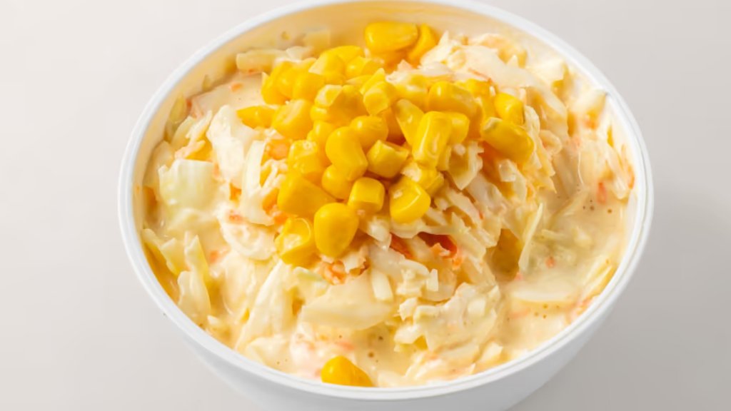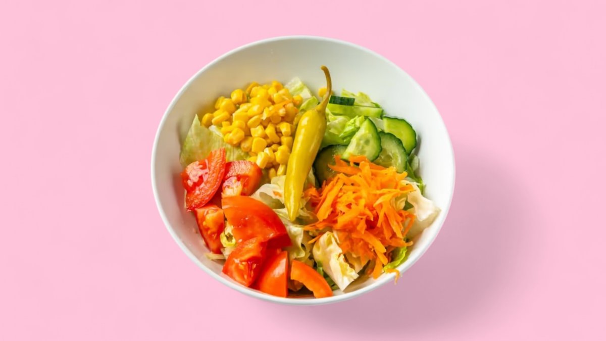 Der gemischte Salat enthält Eisbergsalat, Gurken, Karotten, Mais und Tomaten und darauf Joghurt-Dressing.
