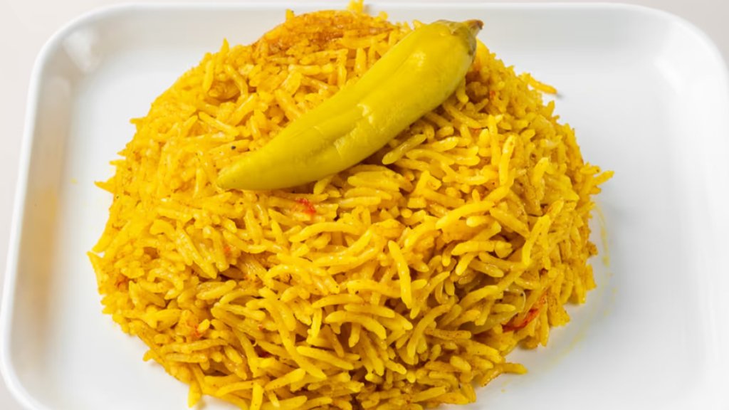 Der enthält einer Portion gelbe (mit Gemüsen und gewürzten) Reis.