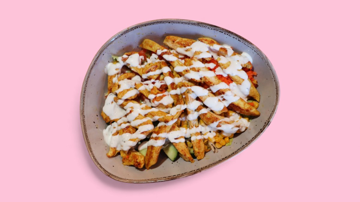 Chickenland Salat enthält Hähnchenfilet, Eisbergsalat, Tomaten, Gurken, Mais, Karotten und darauf Joghurt-Dressing.