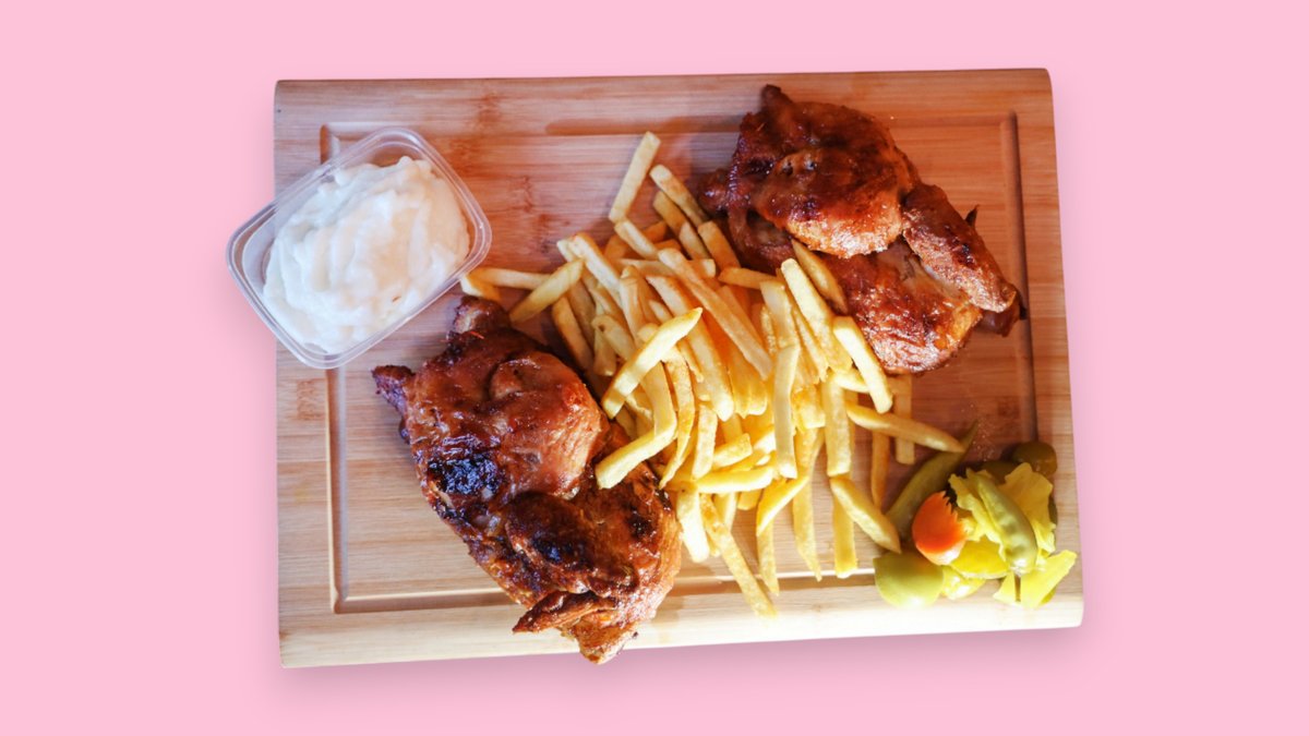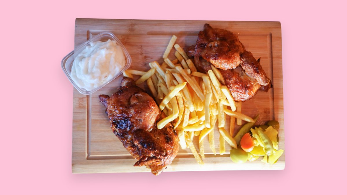 Enthält 2 halbe Hähnchen, Pommes frites, Beilage(Tursu) und große Knoblauch-Soße