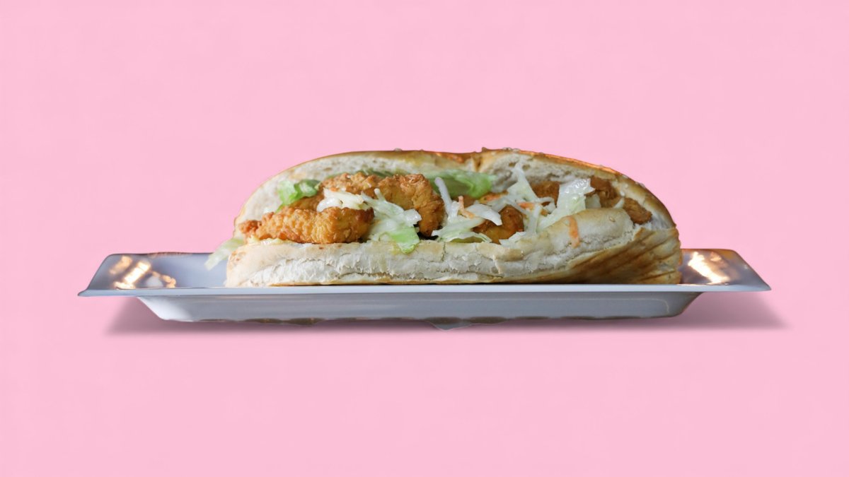 Dieses Baguette enthält panierte Hähnchenbrust, Eisbergsalat, Krautsalat und spezielle Soße.