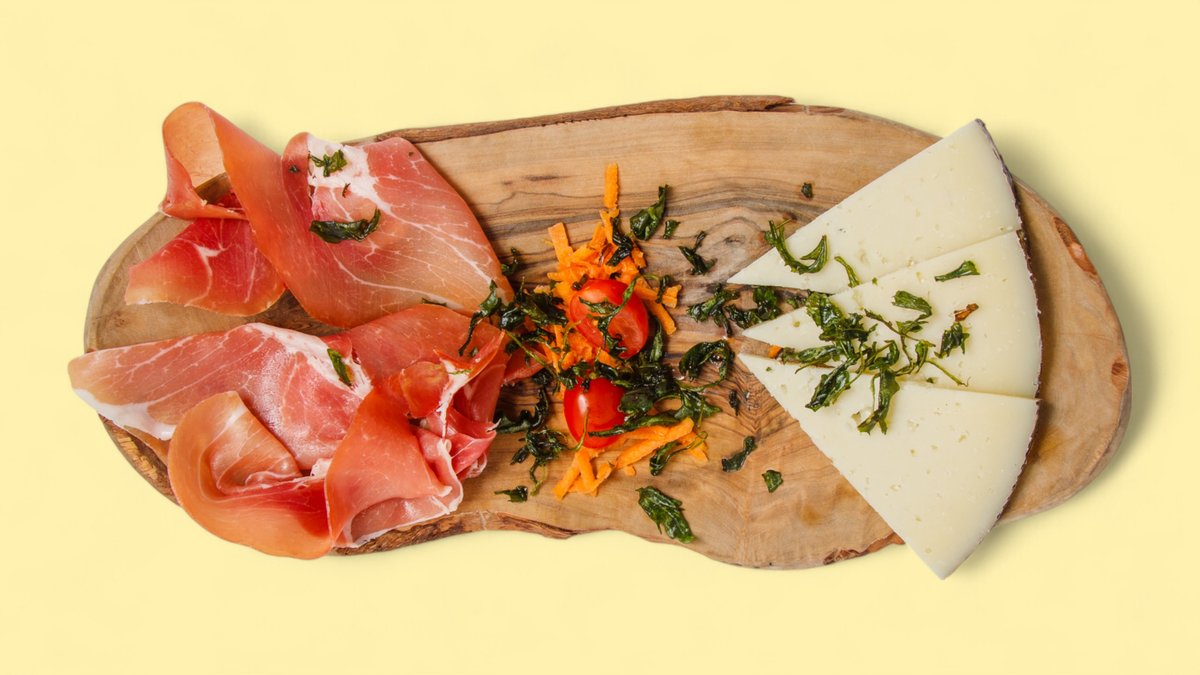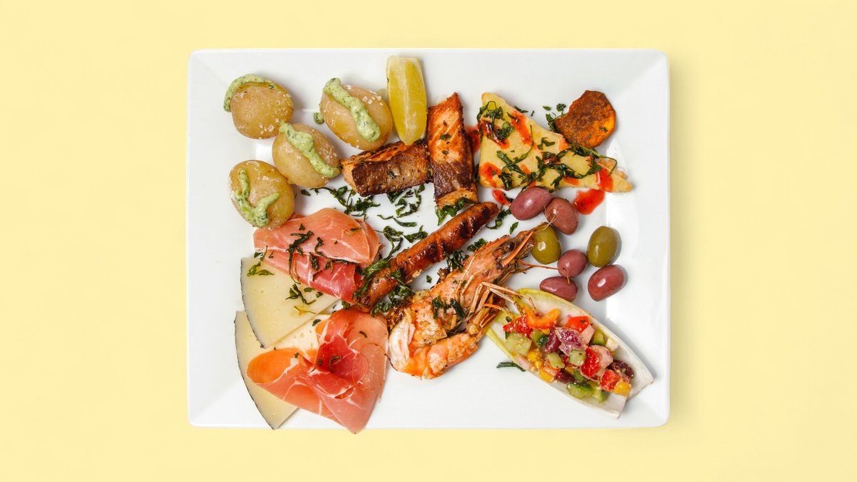 Oliven Jamón Serrano Manchego gebackener Feta Riesengarnele Lachsfilet gebratene Chorizo Kartoffeln mit Salzkruste