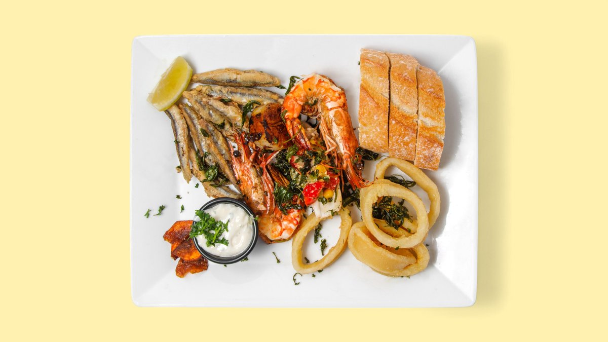 Calamares frittierte Sardellen Jacobsmuschel Riesengarnelen Rucolasalat Brot und Aioli