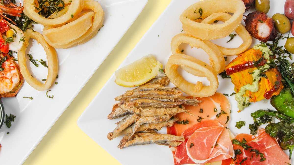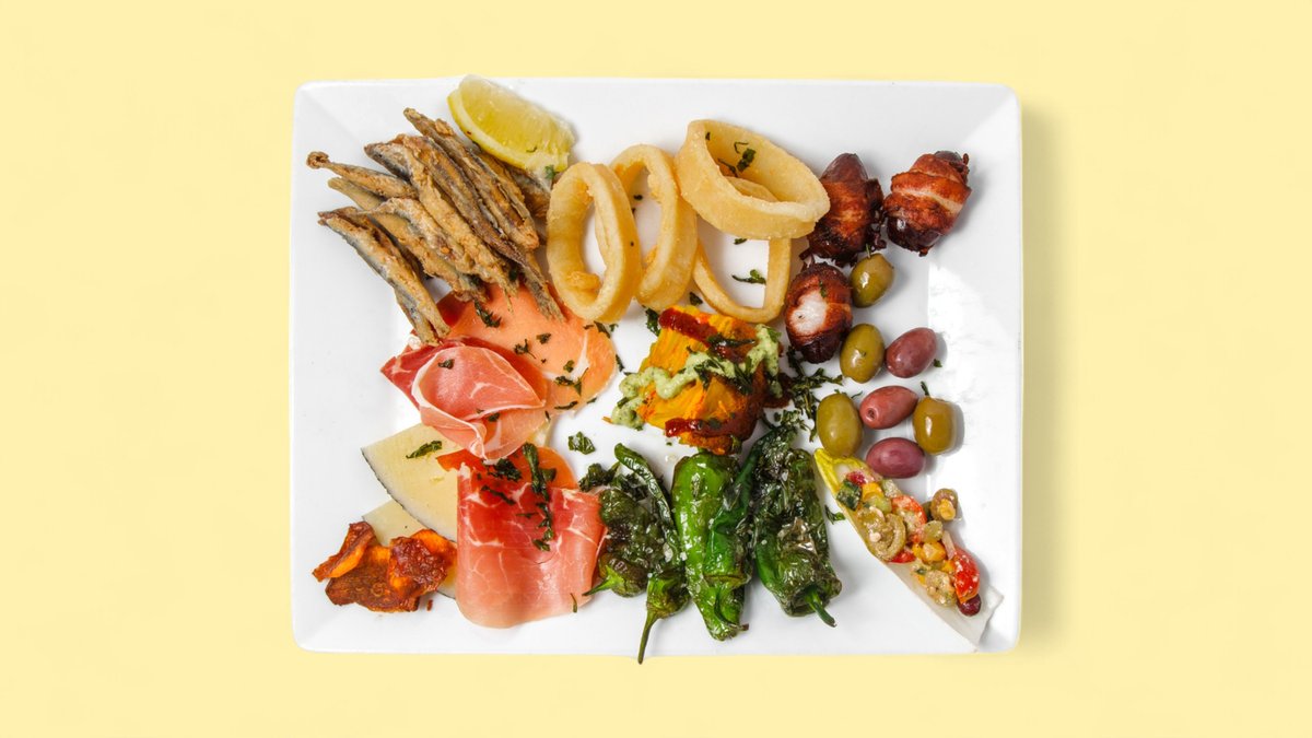 Oliven Jamón Serrano Manchego Kartoffeltortilla Datteln im Speckmantel Calamares frittierte Sardellen Pimientos de Padrón