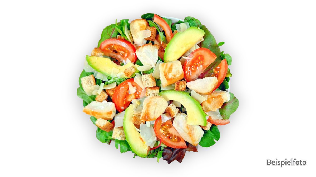 mit Blattsalat, Rucola, Mais, Avocado, Granatapfel und gegrilltem Hähnchenfleisch