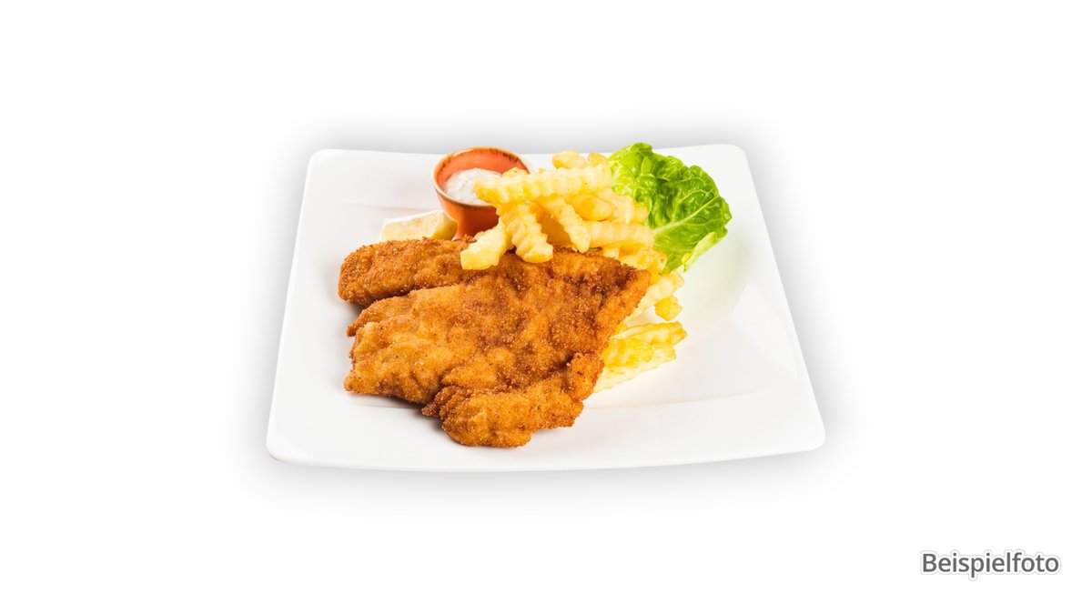 mit Hähnchenstreifen, Pommes und frischem Salat