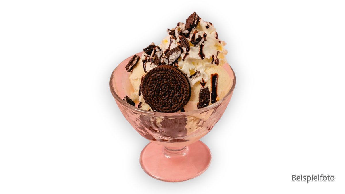mit Schokoladensoße, Sahne, Schokostreuseln und 3 Oreo Keksen