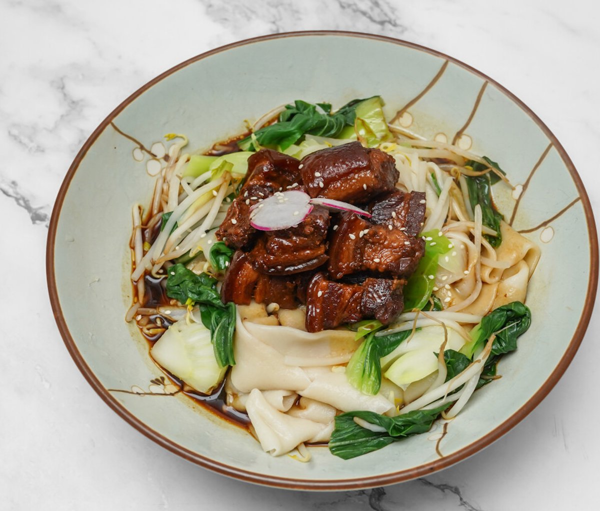 mit zartem, geschmortem Schweinebauch, hausgemachter-würziger Sojasauce und Pak Choi