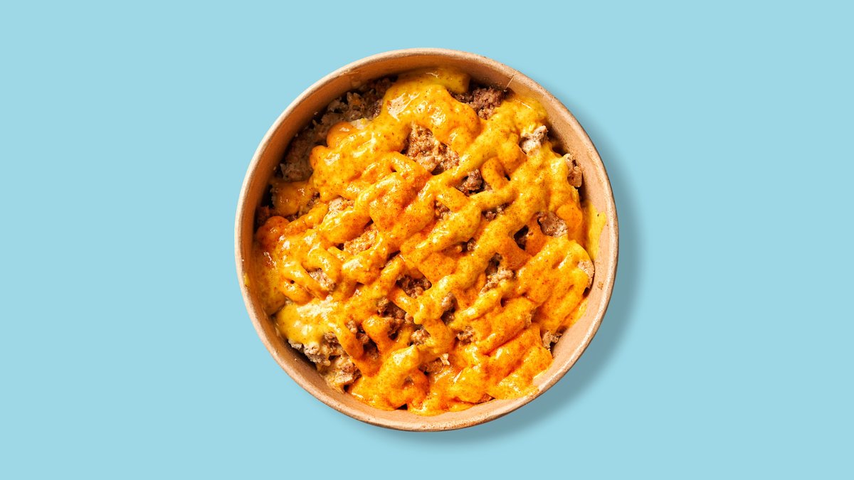 Rindfleisch, Zwiebeln, Jalapeños, Tomaten, Nachos, Pommes frites, Cheddar und Barbecuesoße