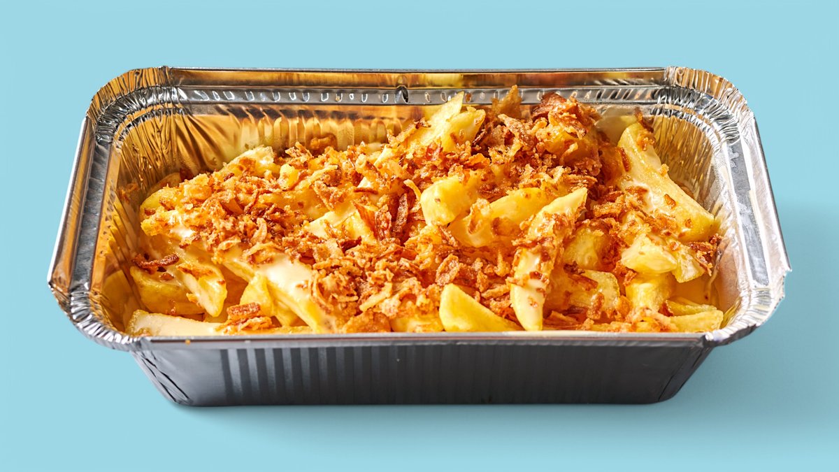 knusprige Hähnchen, Pommes frites, Chicken Nuggets, Käsesoße, knusprige Zwiebeln, Ketchup, Gurken und Mayonnaise