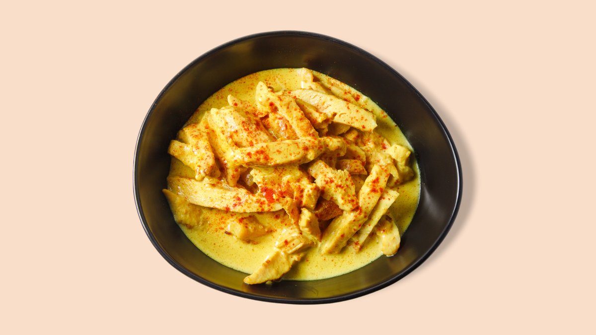 mit Hähnchenfleisch, Paprika, Zwiebeln und Currysahnesoße