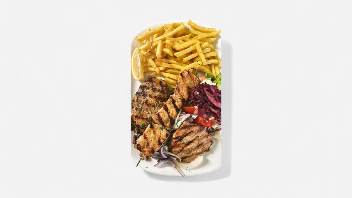 mit Souvlaki vom Schwein, würzigem Gyros vom Schwein, Bifteki vom Schwein, Zwiebeln, Tsatsiki, Pommes frites und Salat