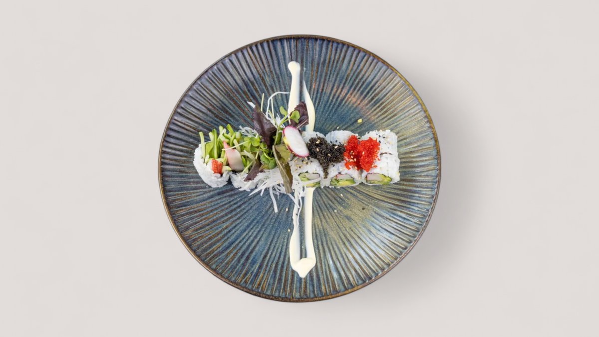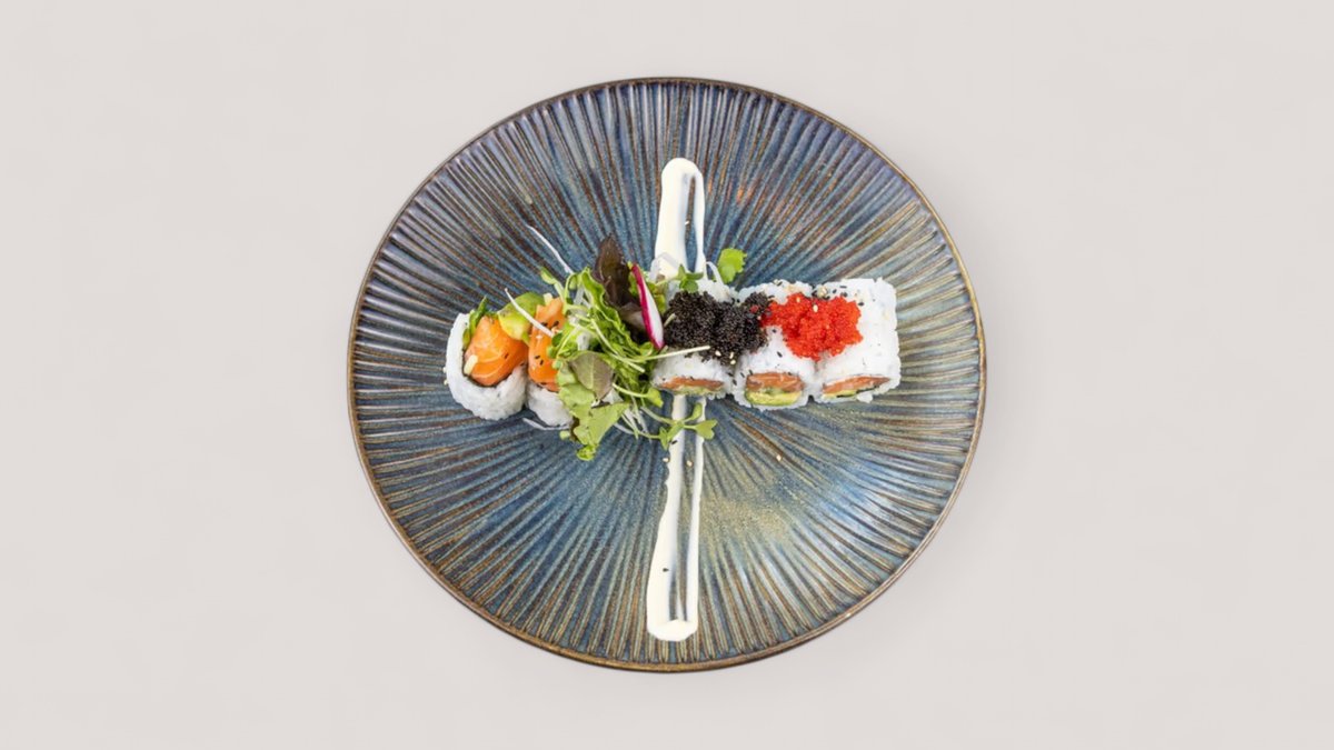 Tempura Garnelen, Avocado und Gurke auf Sushireis, dazu Lachs, Thunfisch, Butterfisch und Hamachi, abgerundet mit würziger Sesam–Teriyaki Glasur