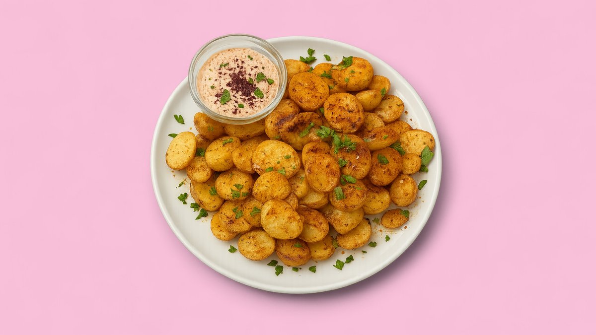 orientalisch gewĂĽrzten Bratkartoffeln, serviert mit Tahini-SoĂźe