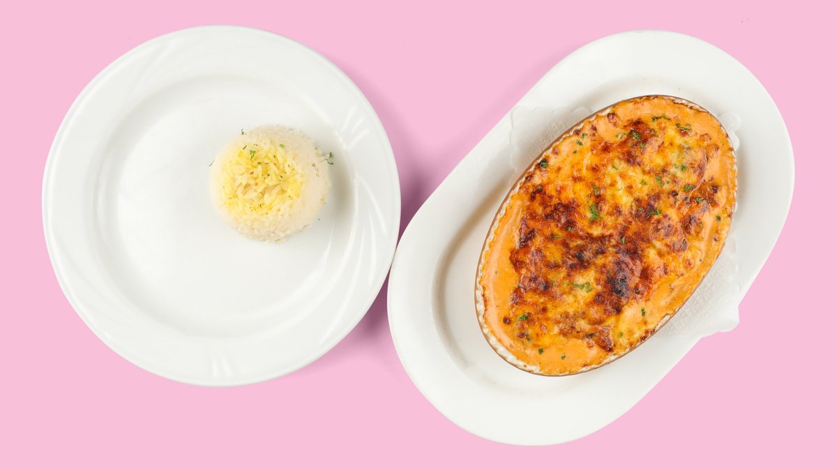 mit Reis, Pommes frites, Spezialsalat, Metaxasoße und mit Käse überbacken