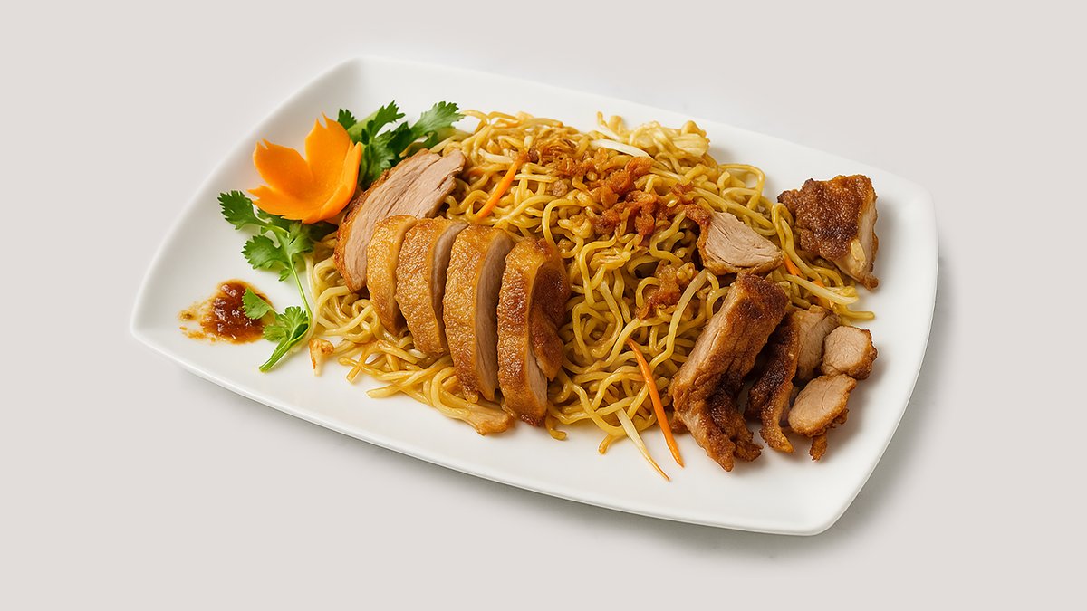 gebratene Reisnudeln mit Ei, gemischtem Gemüse und knuspriger Ente