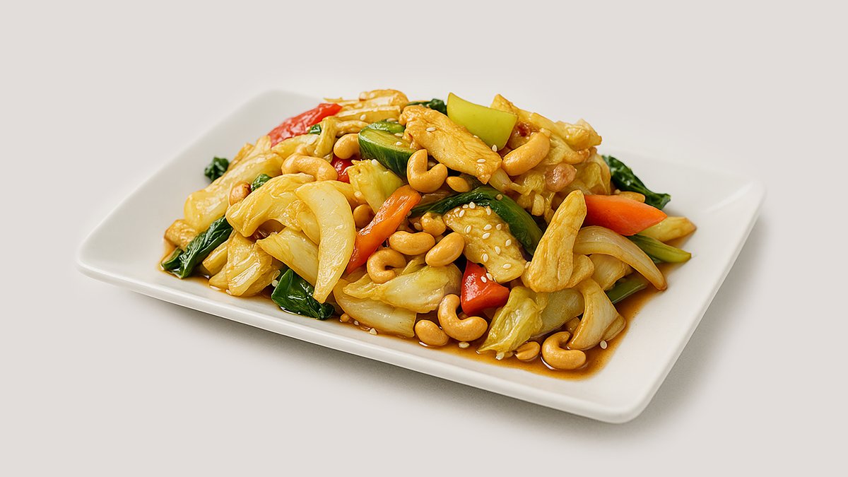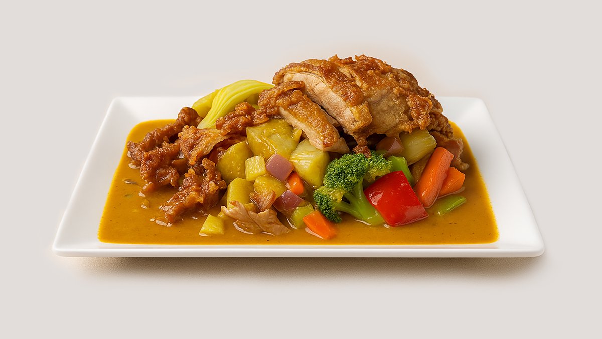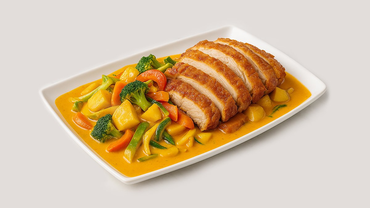 scharf gebackenes Hähnchen mit asiatischem Gemüse in Mango-Currysoße aus Kokosmilch