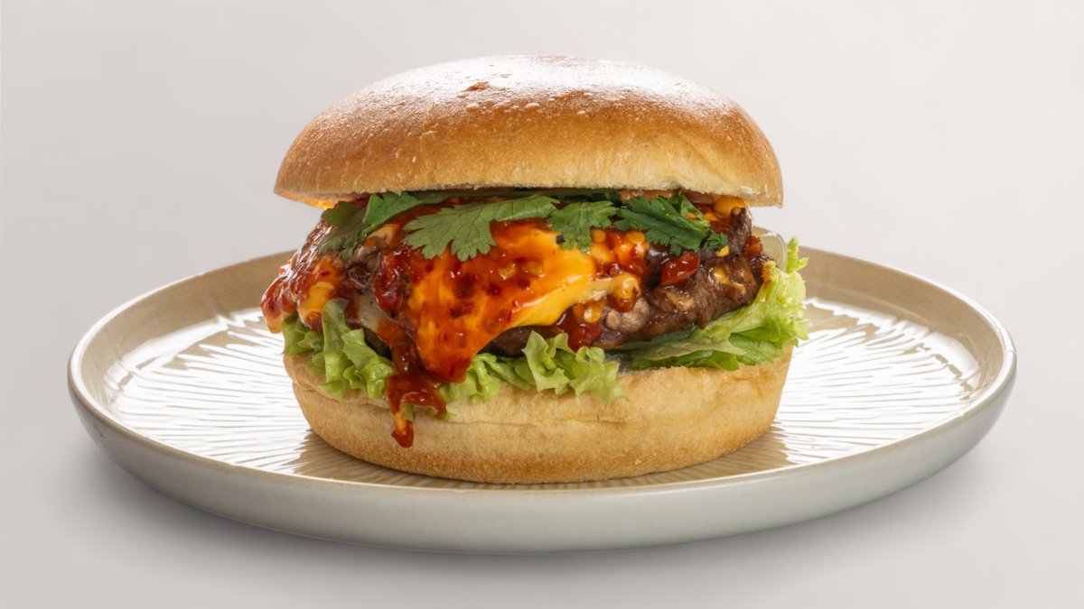 würziges, perfekt gegrilltes veganes Patty mit karamellisierten Zwiebeln, veganem Käse, frischem Salat und einem Hauch Cape-Malay-Gewürze
