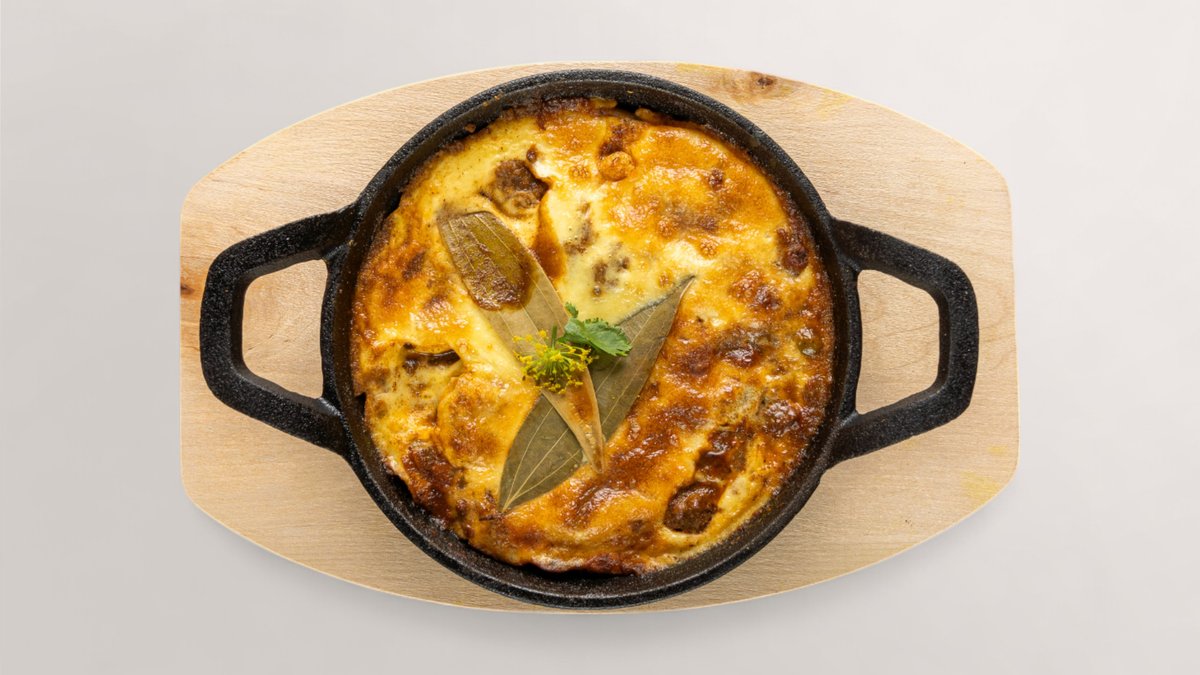 gebacken mit gewürztem Hackfleisch von Rind mit cremigem Eierguss serviert mit gelbem Reis und Sambal-Salat