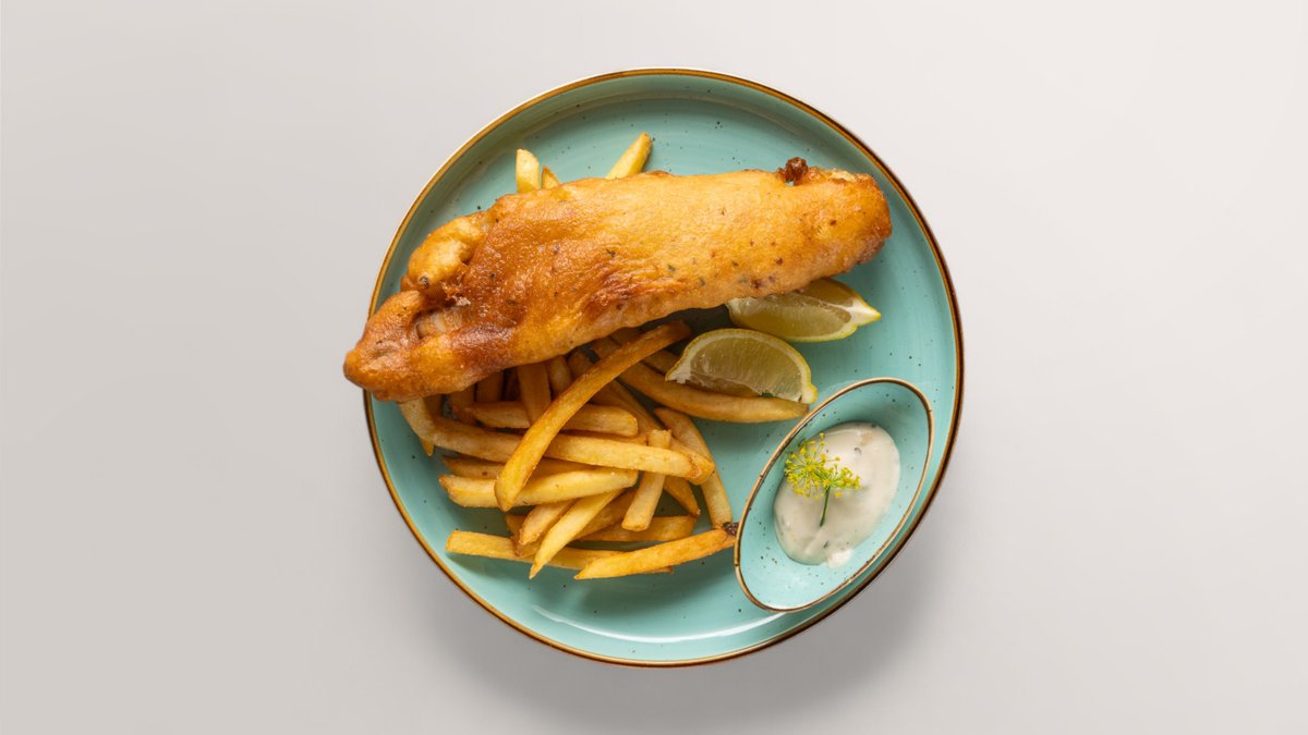 knusprig ausgebackener Seehecht mit goldenen Slap Chips und Essig