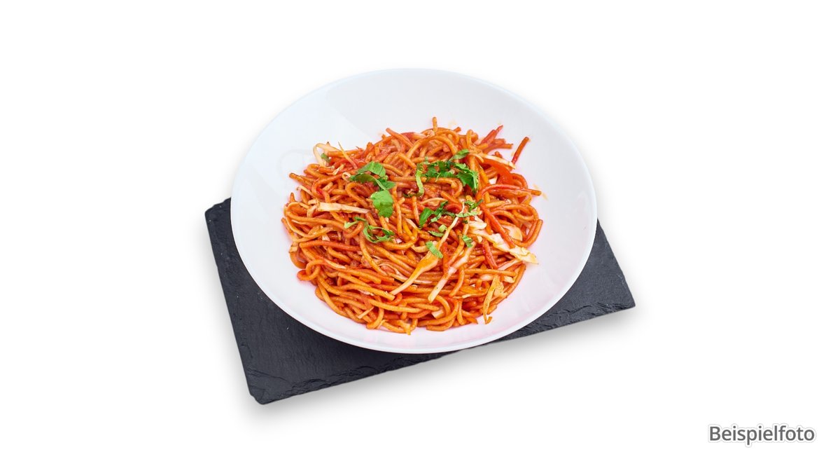 gebratene Nudeln mit Schezwan Soße und gemischtem Gemüse serviert