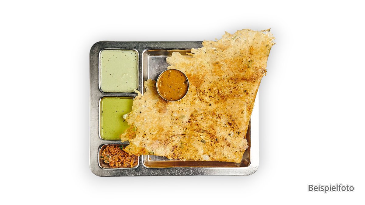 2 Stück Teigtaschen gefüllt mit gewürzten Kartoffeln und Erbsen, dazu ein spezielles Chutney