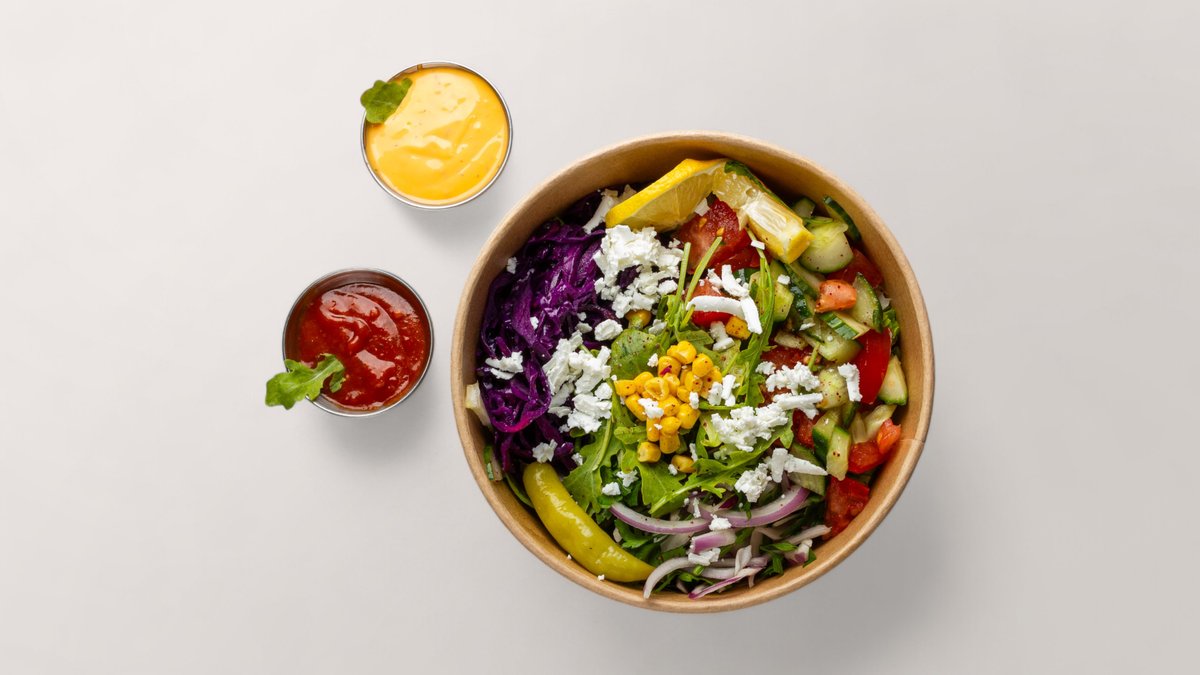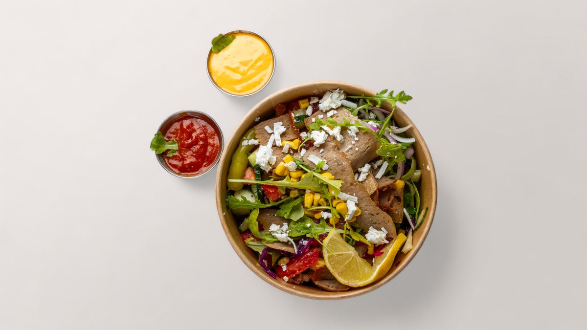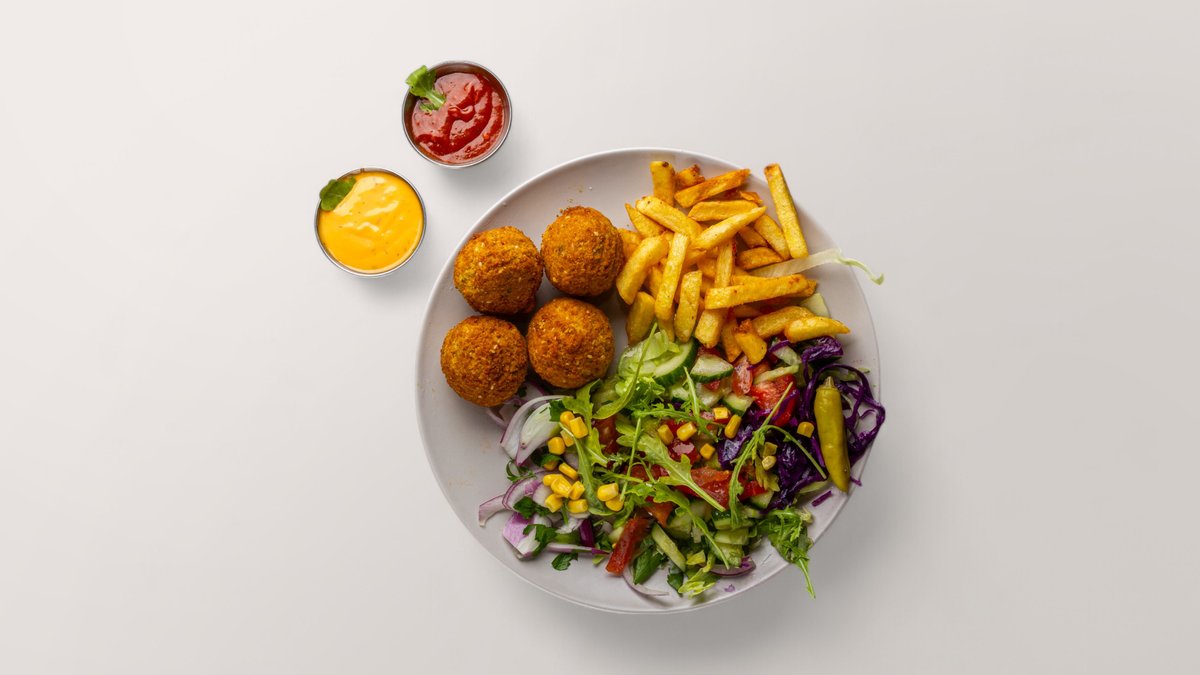 alle Gerichte werden mit Kichererbsenbällchen, grünem Salat, Zwiebeln, Tomaten, Gurken, Rotkohl, Rucola, Zitrone, Mais, Peperoni und einer Sauce nach Wahl zubereitet