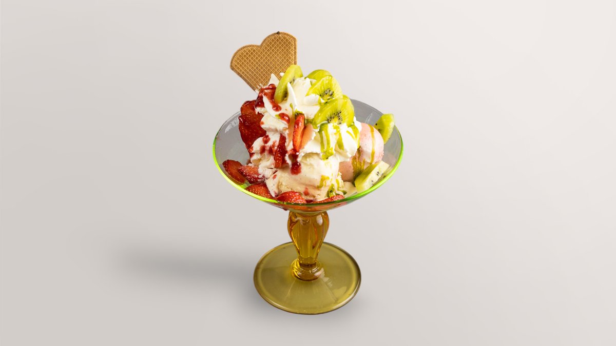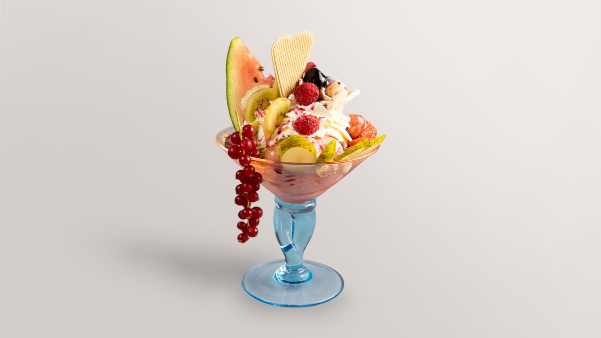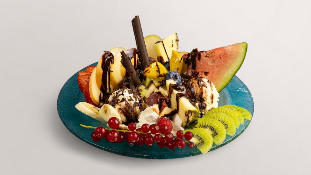 mit Vanillegeschmack, sämtlichen Fruchtarten, Schokostreuseln und Schokosoße Das Gericht wurde mit Schokolade zubereitet und kann Spuren von Nüssen enthalten