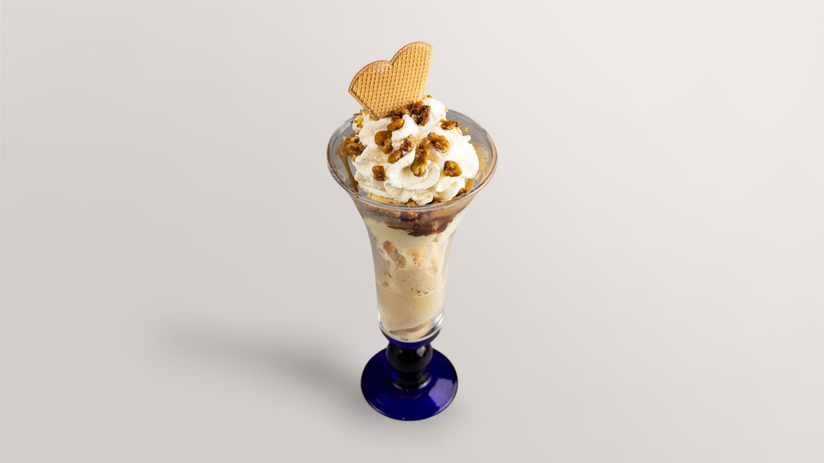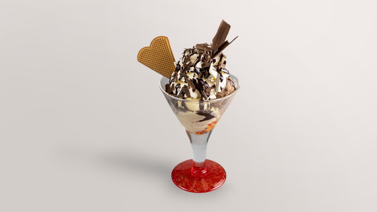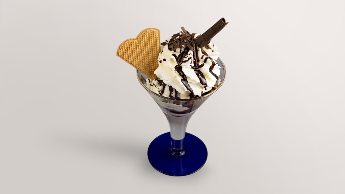 Eis mit Vanillegeschmack, Kakao, Schokostreuseln, Schokosoße und Sahne, serviert in einer Größe deiner Wahl Das Gericht wurde mit Schokolade zubereitet und kann Spuren von Nüssen enthalten