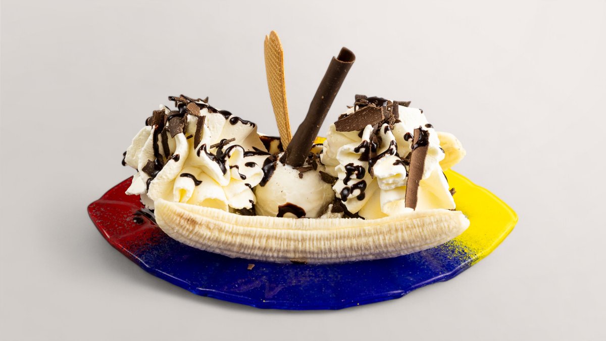mit Vanillegeschmack, Bananen, Schokostreuseln und Schokosoße Das Gericht wurde mit Schokolade zubereitet und kann Spuren von Nüssen enthalten