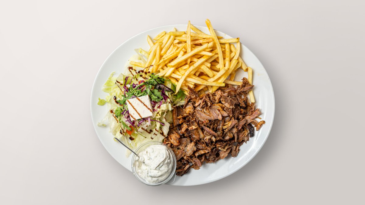 Fleischspieß im Yufkabrot mit Salat, Soße und Cacik