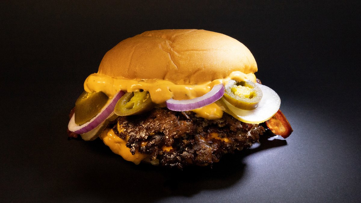 Double Smashed Beef Patty mit Bacon, Jalapeños, doppeltem Cheddar, hausgemachten Gurken, Zwiebeln, Biggy und Käsesoße