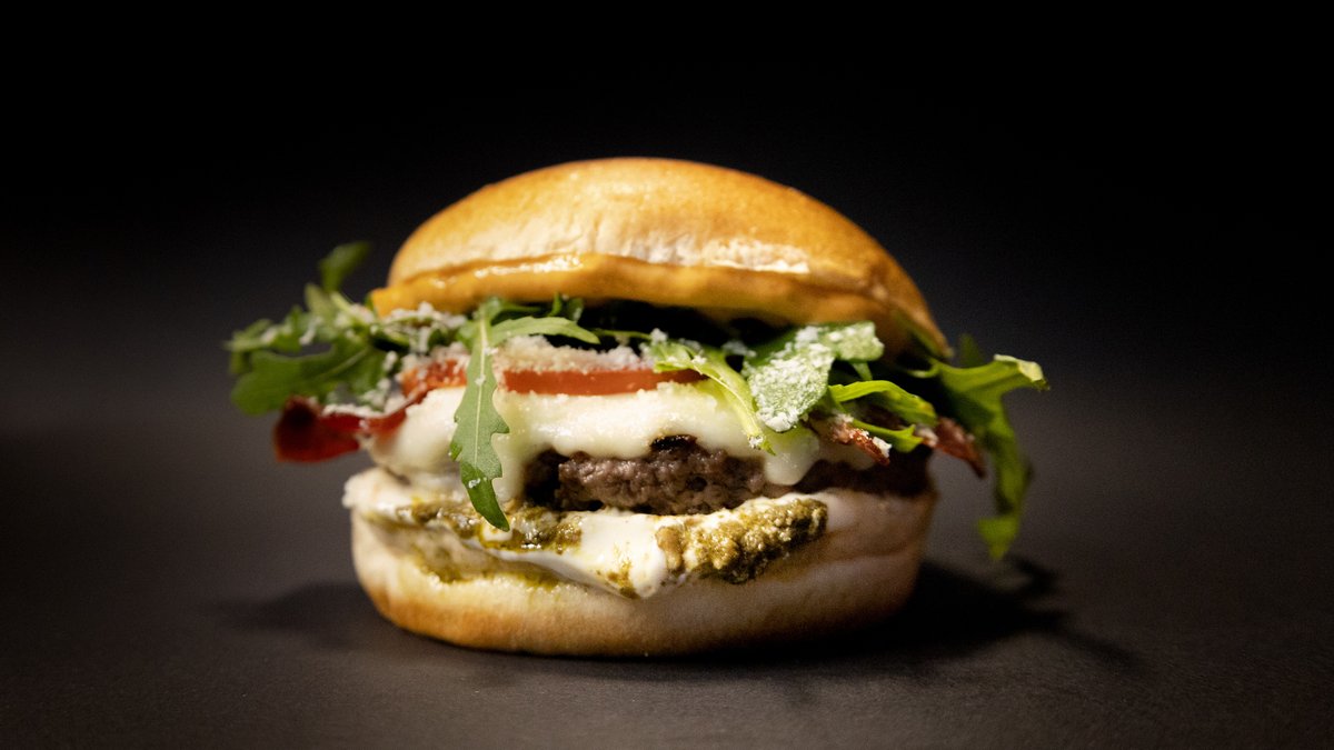 mit Beef-Patty, Rinderrohschinken, Rucola, Mozzarella, Parmesan, Tomaten, Aioli und Pesto Verde