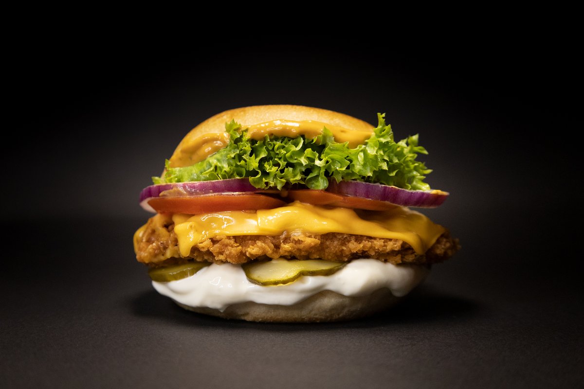 mit Crispy Chicken, Cheddar, roten Zwiebeln, Tomaten, sauren Gurken, Lollo Bionda und Aioli