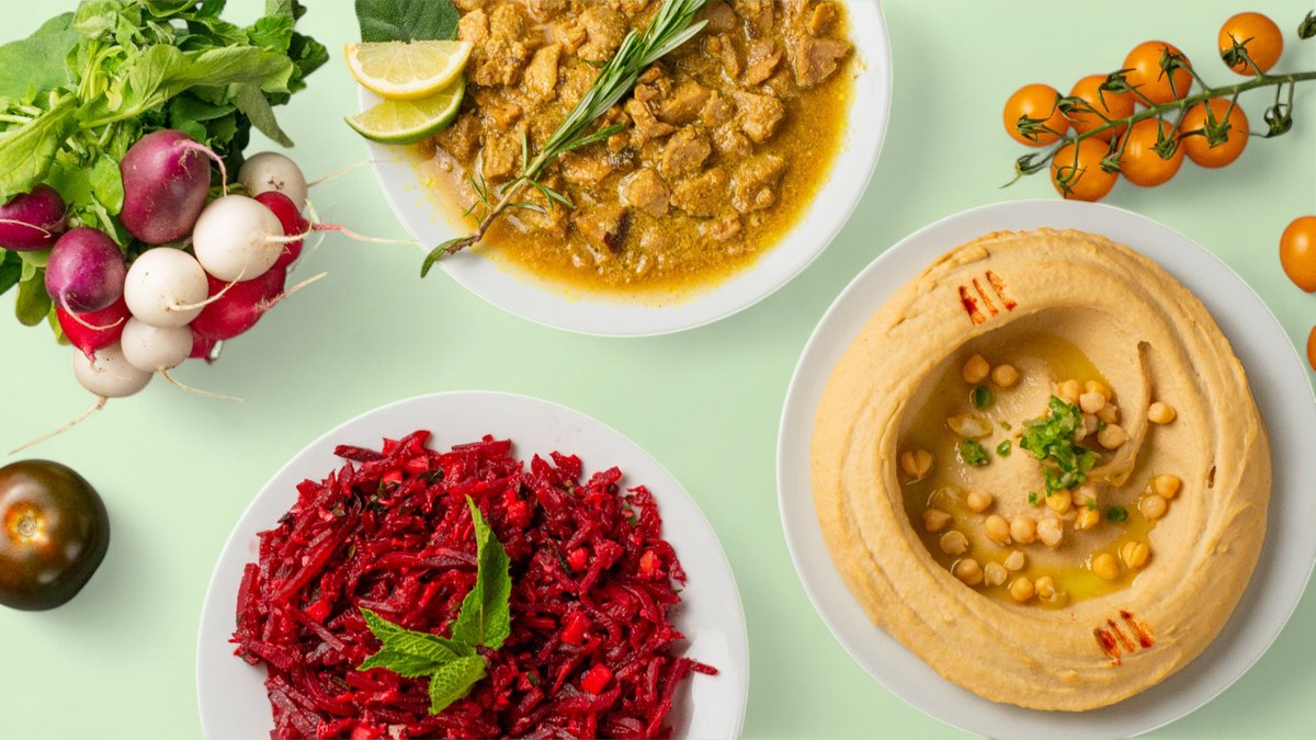 mit Tabbouleh-Salat, hausgemachtem Hummus, scharfer Paprika, ArabesQ Salat mit Granatapfel, 2 frittierten Hirtenkäse-Sticks, 2 Falafeln, Auberginenpaste mit Knoblauch, frisch gebackenem Brot, Joghurt-Dip mit Minze, Okra in Tomatensoße, Bratkartoffeln mit Gemüse (leicht scharf), Aladdin Salat mit Ananas und Mandeln, Riesenbohnen in Tomatensoße, Bulgursalat mit Rote Beete-Paste, Couscous Salat und in einer Größe deiner Wahl