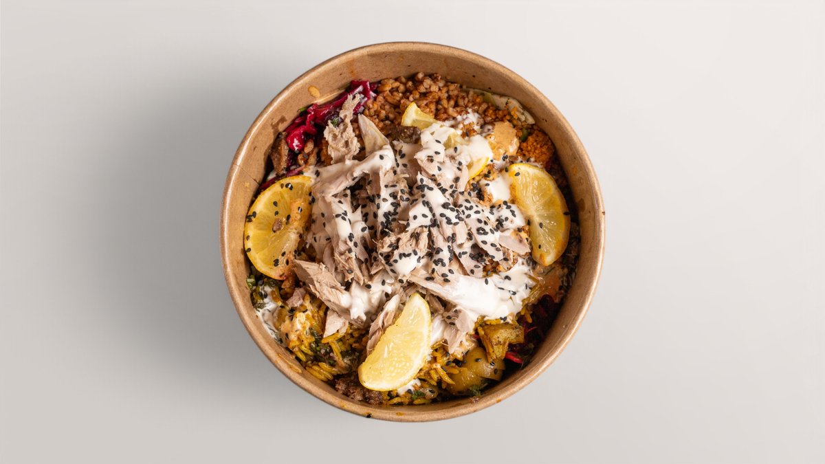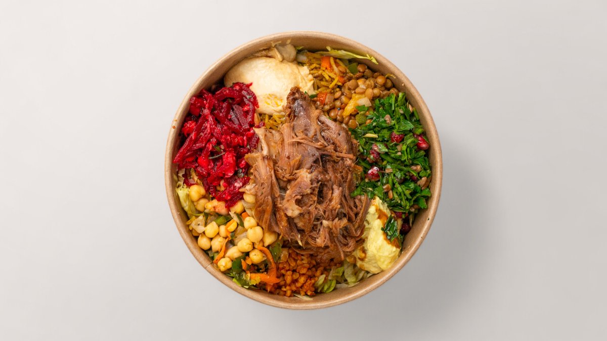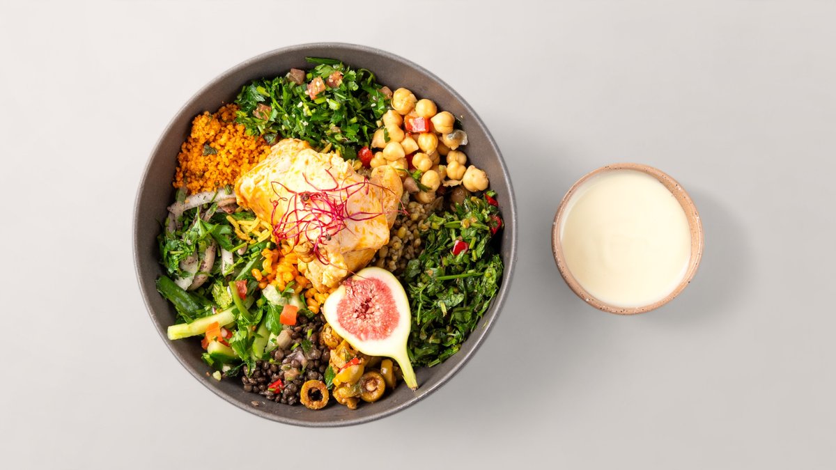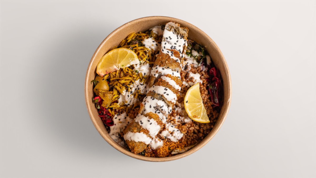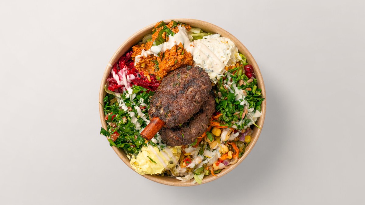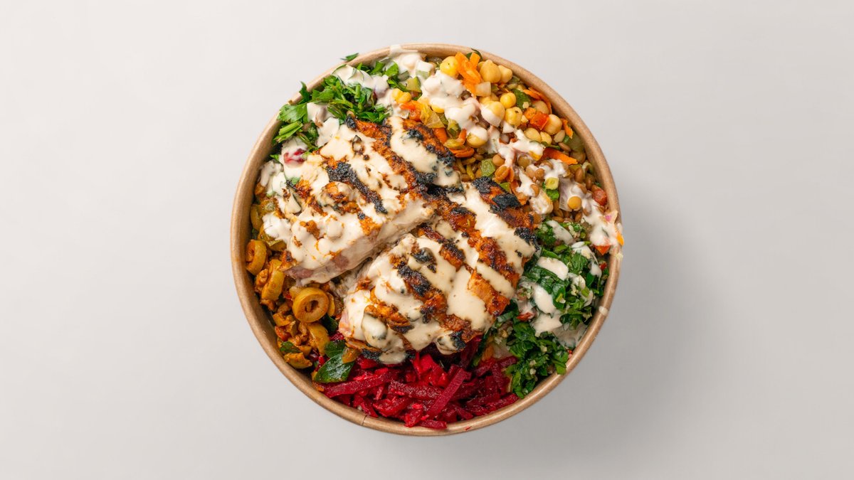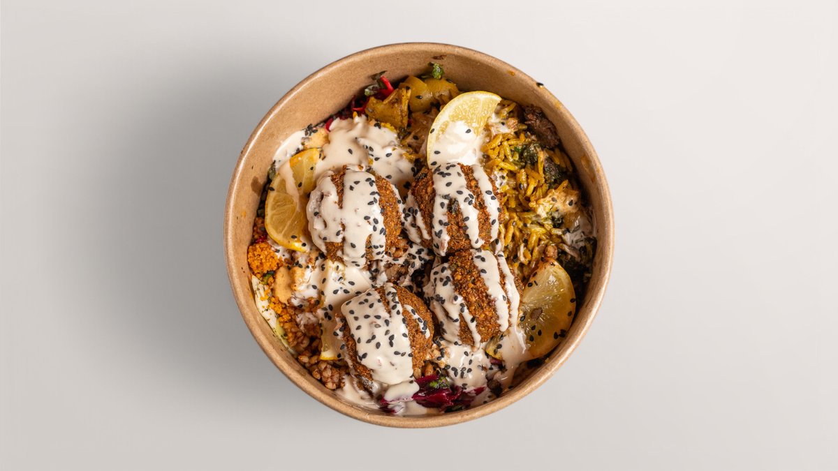 alle Bowls werden mit Gemüsereis, Bulgur, schwarzem Linsensalat, ArabesQ-Salatauswahl (Petersiliensalat, Fattoush-Salat, Eisbergsalat), Linsen, grünen Oliven und hausgemachter Soße deiner Wahl zubereitet