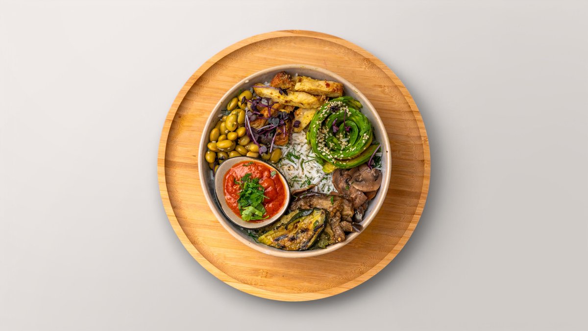 mit Reis, Edamame, Rotkohl, Sesam, Hähnchen, gegrilltem Gemüse und Avocado
