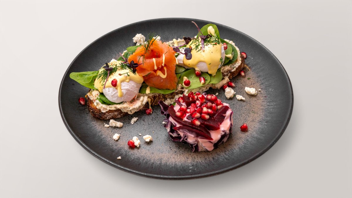frisches Dinkelbrot,2 pochierte Eier, Feta-Dip, Spinat, Räucherlachs, Hollandaise Sauce und Dill
