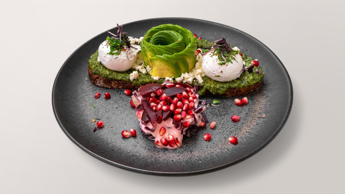 frisches Dinkelbrot,2 pochierte Eier, Feta, hausgemachtes Pesto, Avocado, Petersilie
