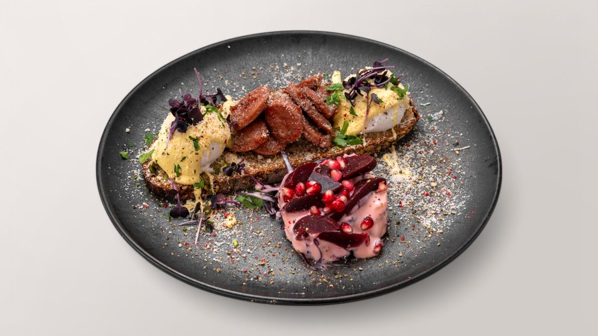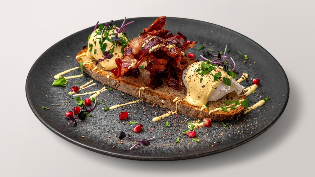 frisches Dinkelbrot,2 pochierte Eier, Rinder Bacon, Hollandaise Sauce, Petersilie